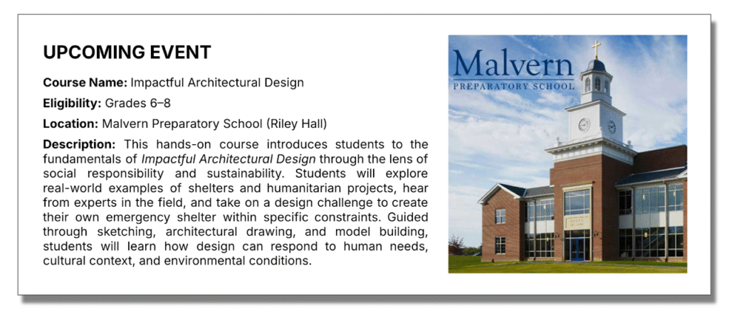 Impactful Architectural Design empowers students to see architecture as more than structures. It is a tool for empathy, sustainability, and social responsibility. Through hands-on design challenges, real-world case studies, and guidance from humanitarian experts, students learn to create designs that respond to human needs, cultural values, and environmental conditions. Our mission is to inspire the next generation to view architecture not simply as form but as a means to build a fairer and more sustainable world.